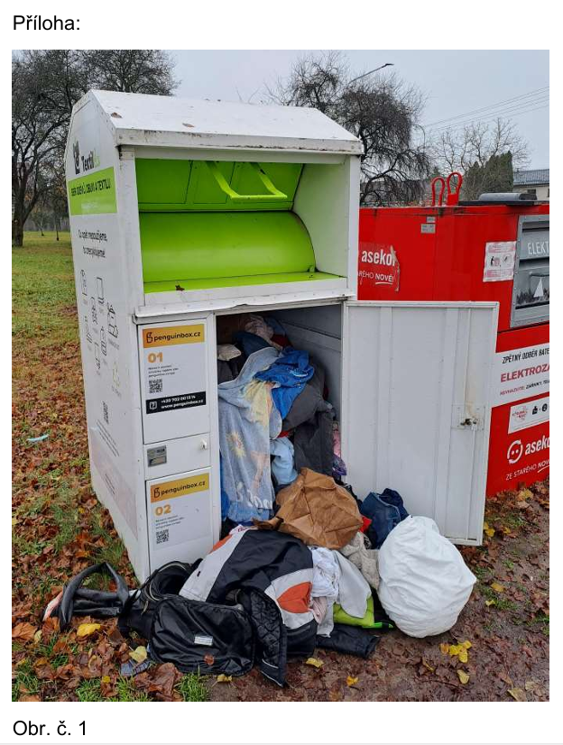 Upozornění na nepořádek u kontejnerů na textil. Komise projednala opakované případy narušování a násilného otevírání kontejnerů na textil v lokalitách Trpínky a Sídliště Svornosti, v jejichž důsledku dochází k rozhazování textilu v okolí. Podobná situace byla zaznamenána i v jiných částech města. Viz příloha obr. č. 1. Usnesení komise: Komise doporučuje Radě města požádat provozovatele kontejnerů na textil o zajištění: – funkčnosti a zabezpečení kontejnerů, – úklidu textilu v jejich okolí.